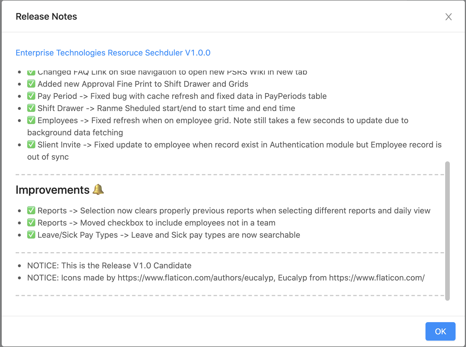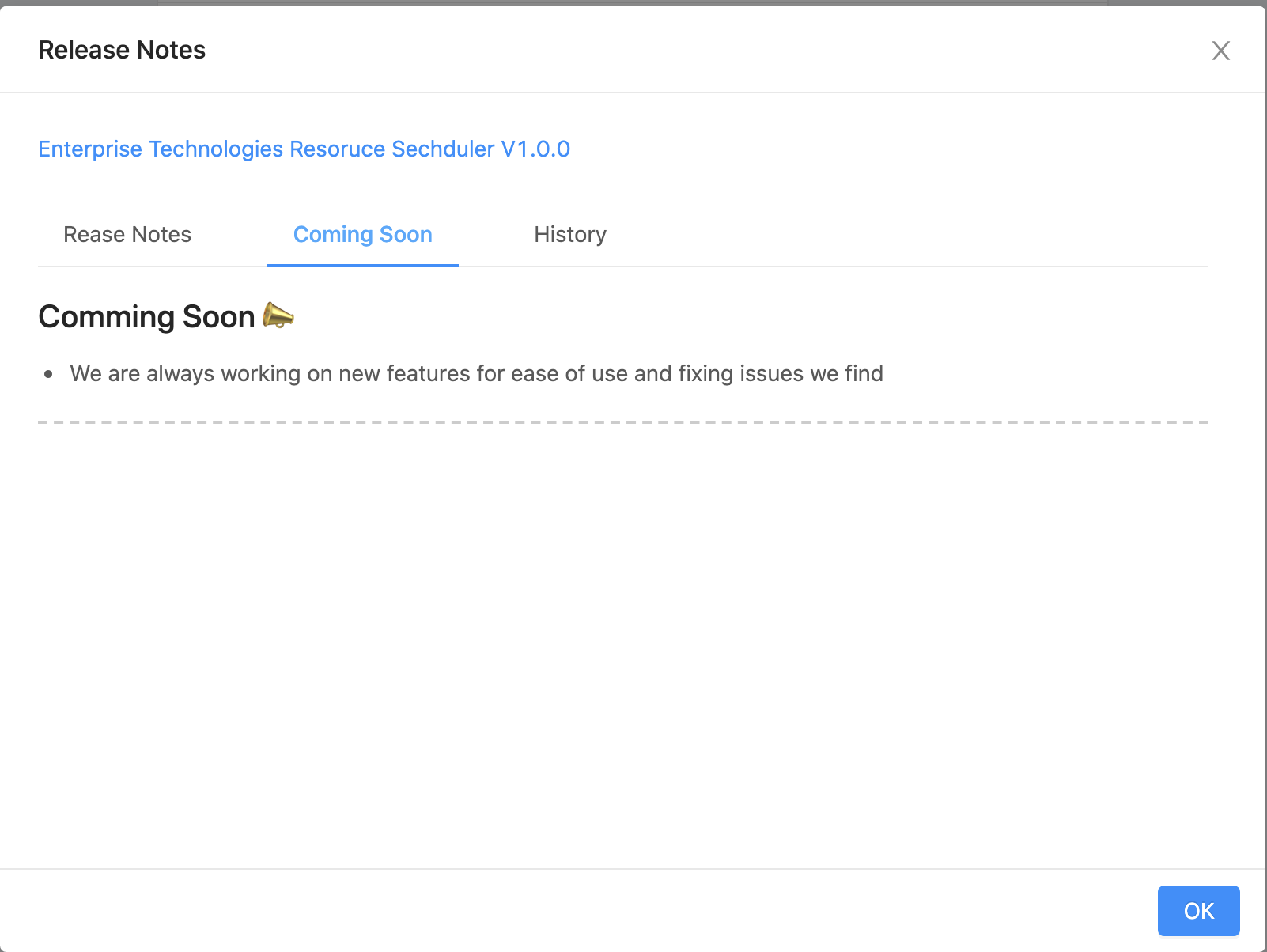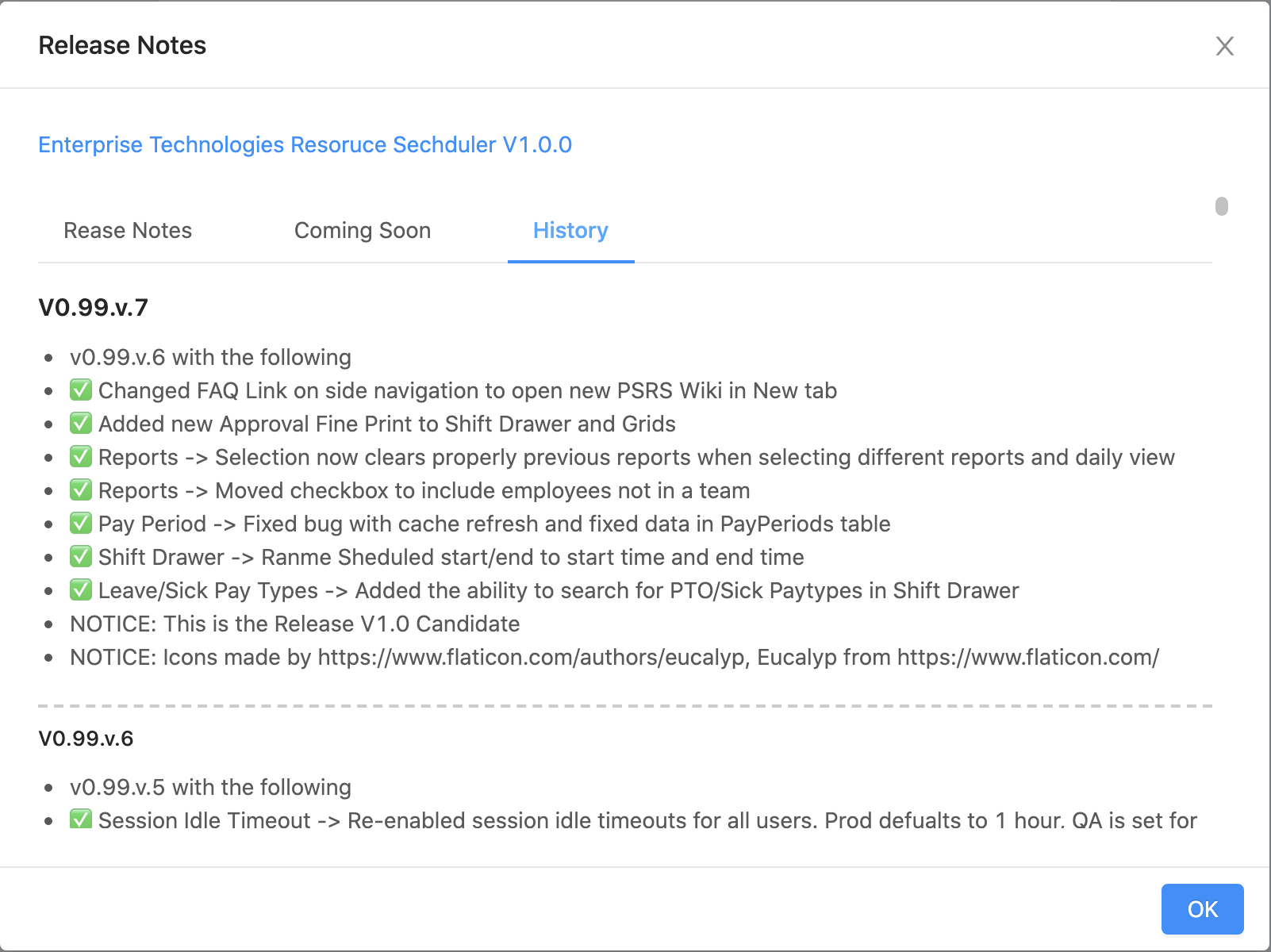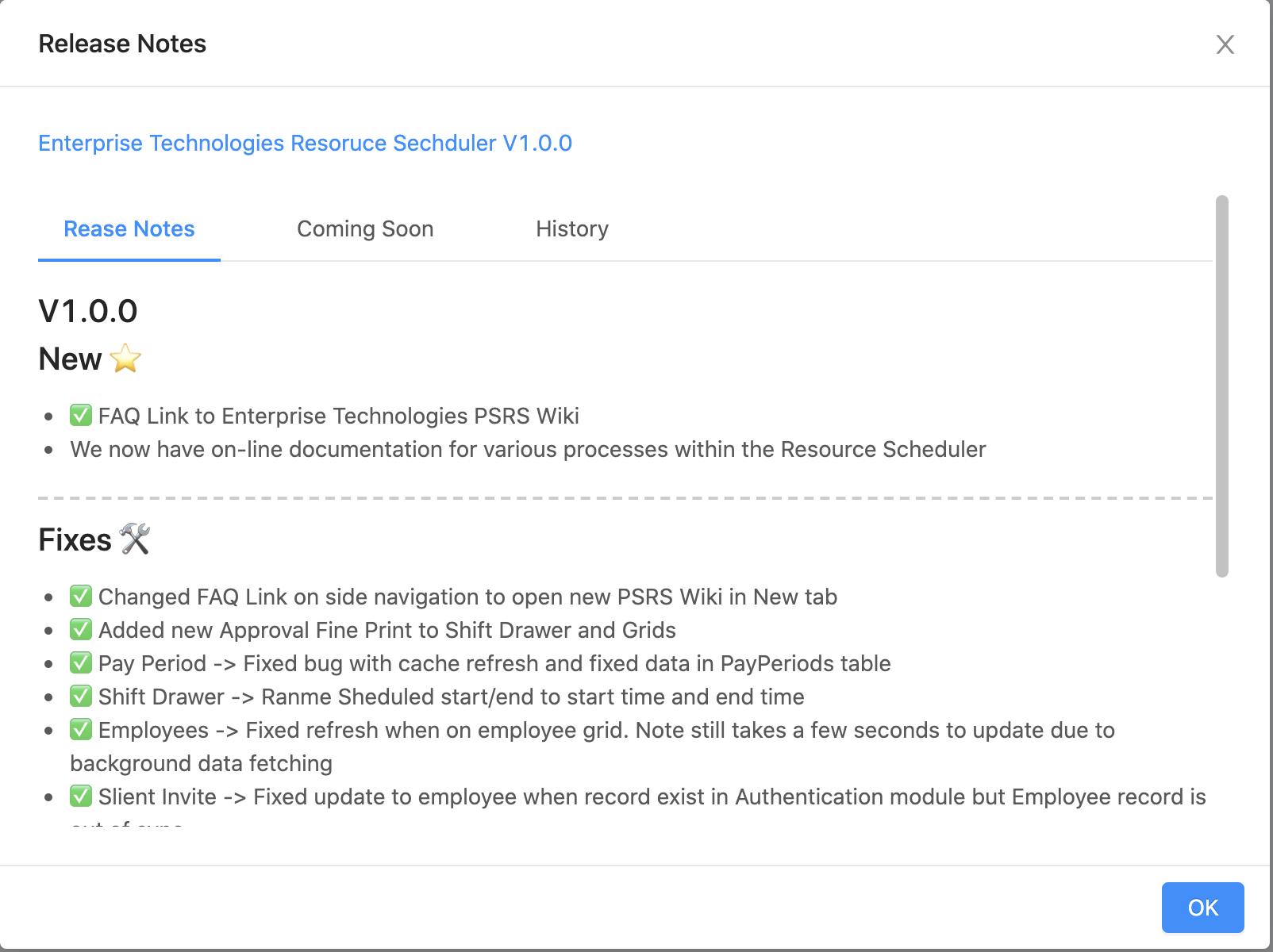 | Version / Release information can be found by double clicking on the version box in the lower left corner of the screen. This is available on any screen in the Resource Scheduler. It will provide information about the current release, new features in a future release and a limit amount of history about other releases. |